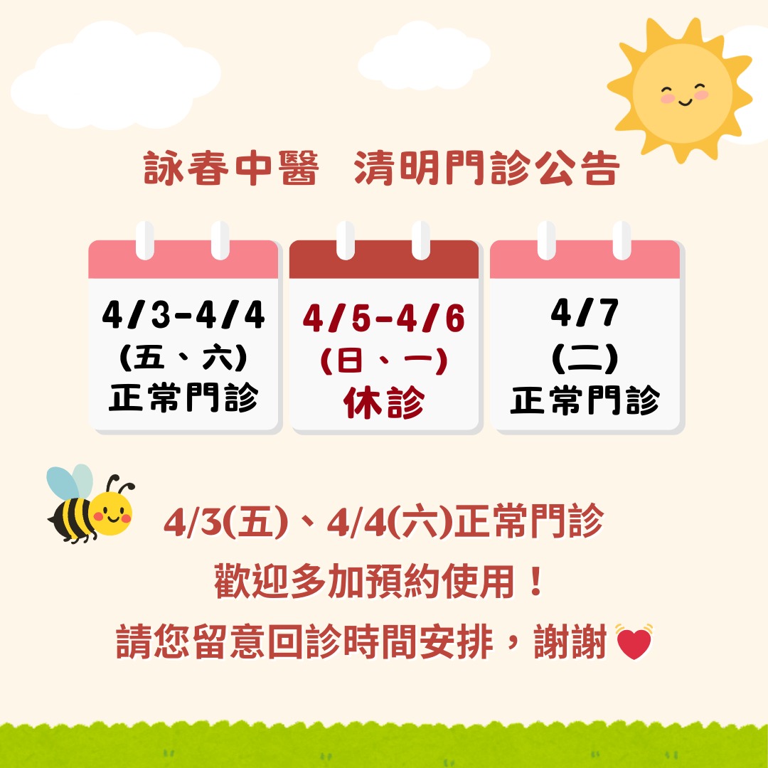 4/3(五)-4/4(六)詠春中醫正常門診✨